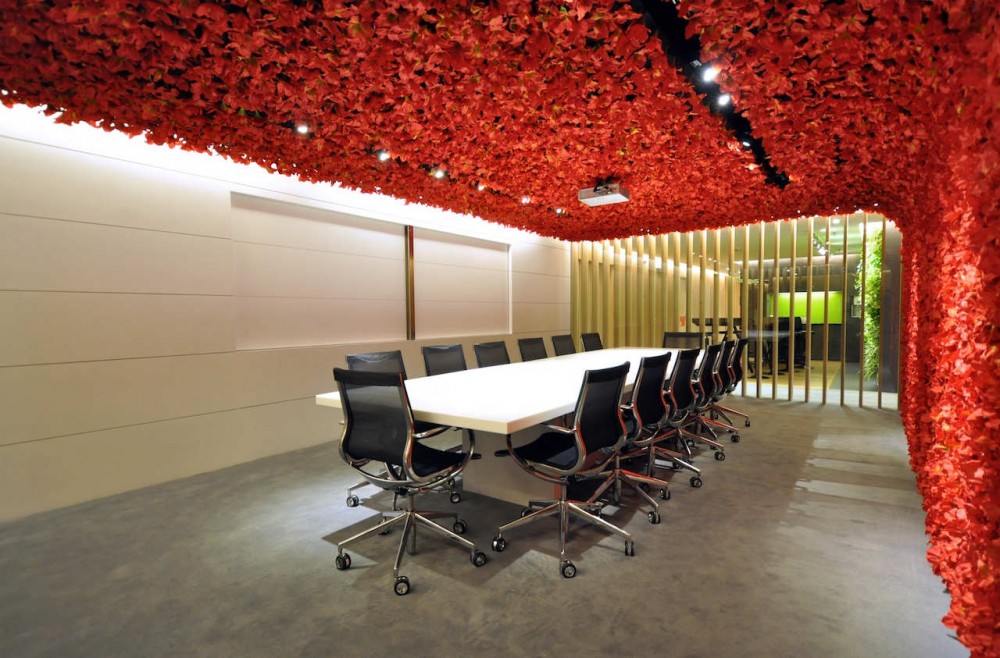 令人驚艷的會議室,那滿目鮮艷欲滴的紅色花卉彌漫了大半的會議室空間;小型會議室則以美麗的蝴蝶為設計主題,疏密的布局令空間充滿動感;