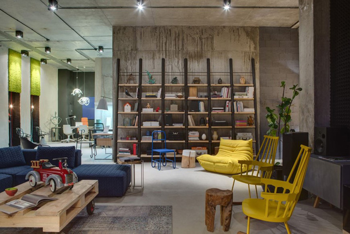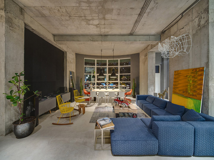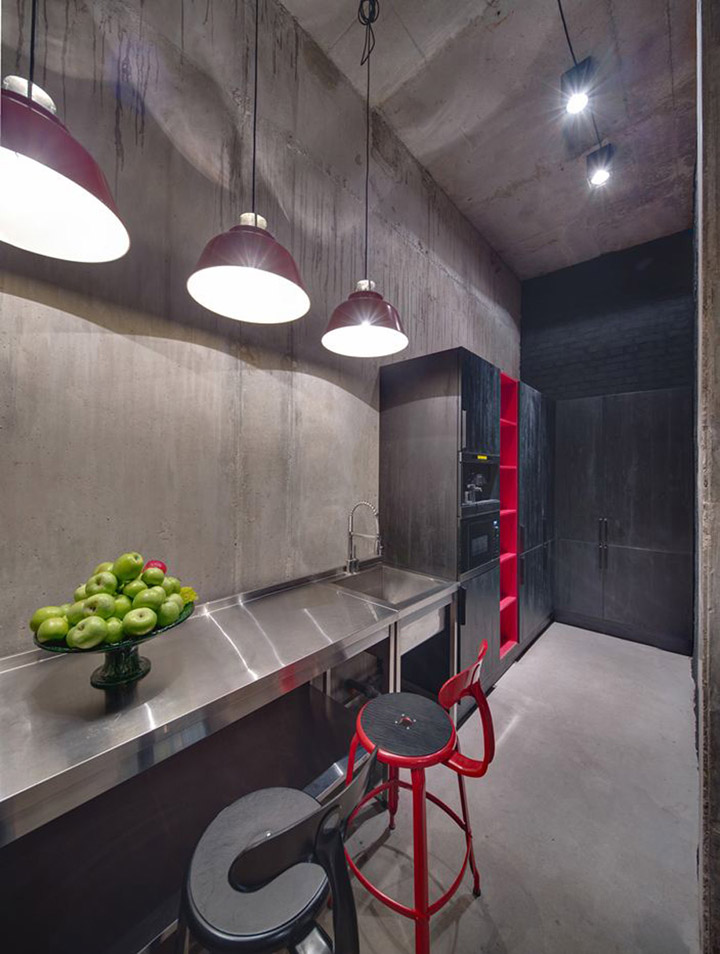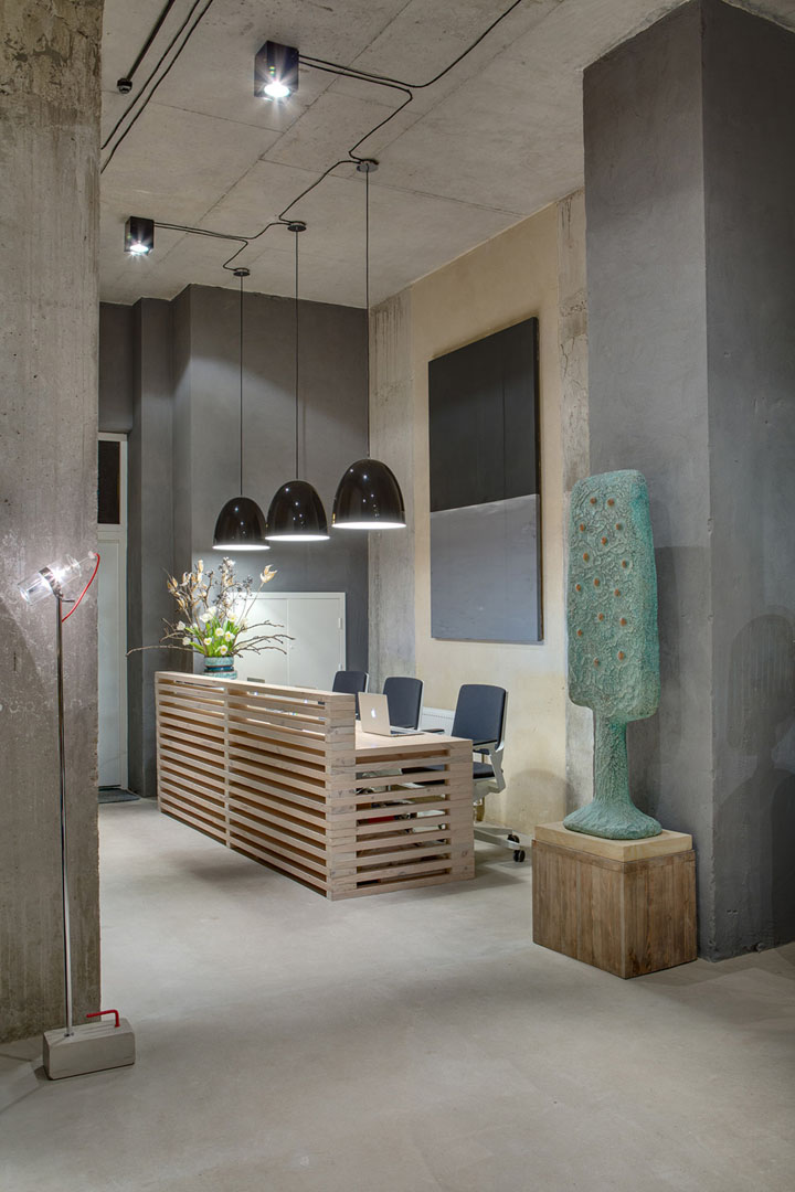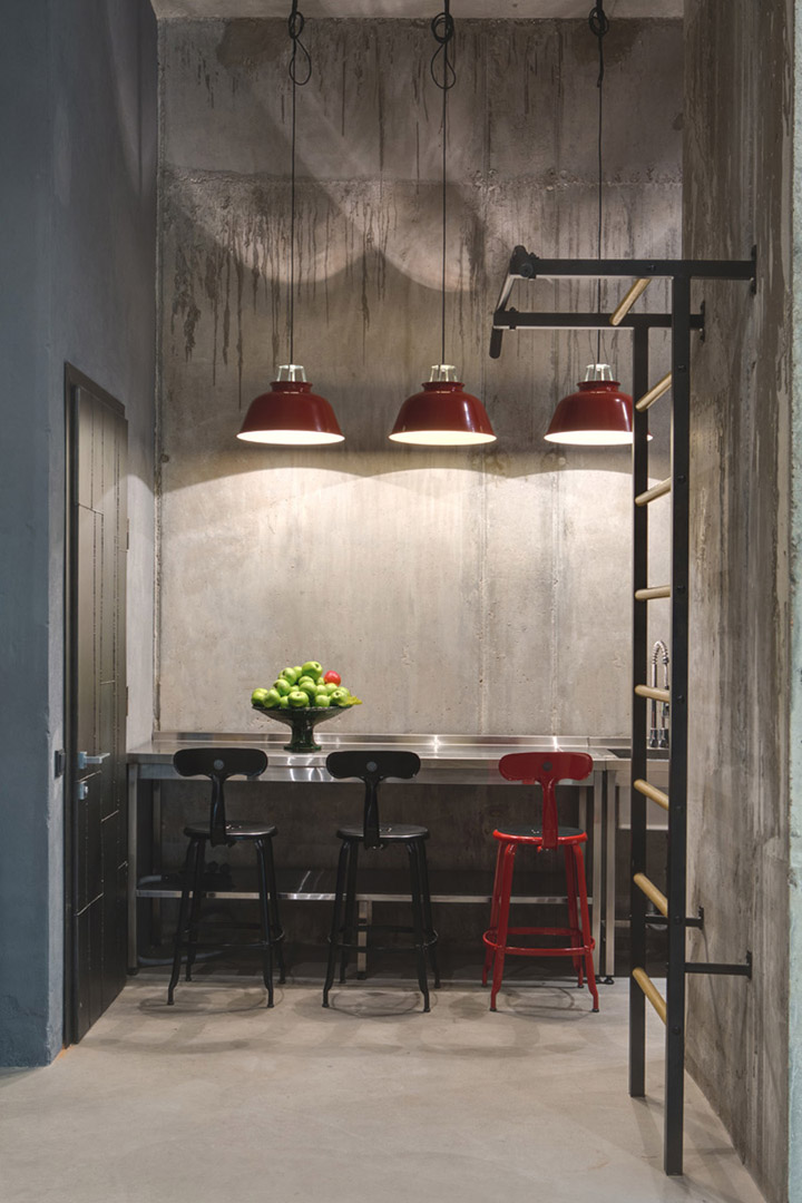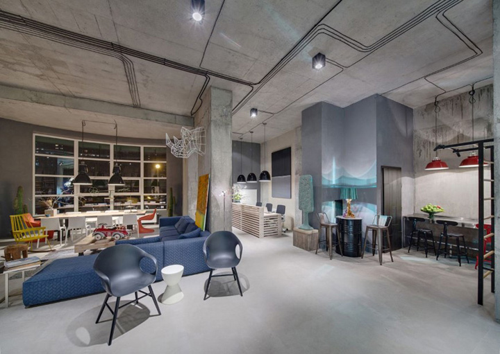 設(shè)計(jì)師盡量不去改變?cè)袎w構(gòu)造,并完全保留原有的水泥墻和水泥頂板。自然原始的材質(zhì)表面在藝術(shù)品的襯托下反而呈現(xiàn)出自然樸素的美感。頂面的管道布線經(jīng)過(guò)仔細(xì)編排,為原本平淡無(wú)趣的頂面增添了許多設(shè)計(jì)美感。